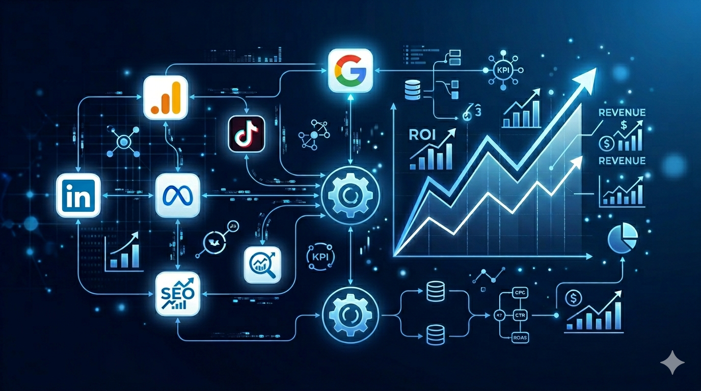 We design, build, and optimize the integrated revenue infrastructure that connects your marketing, sales, and operations, through RevOps strategy, MarTech implementation, AI automation, CRM integration, and performance marketing. Everything works together. Nothing works in isolation.